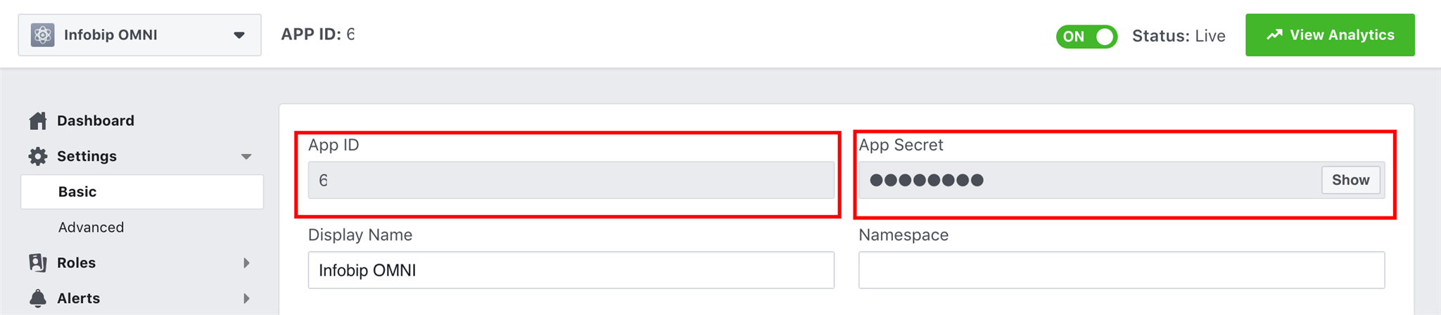 Use the Page Access Token from the previous step as a value of the accessToken parameter, App secret as a value of the secret parameter and App ID as a value of the id parameter.