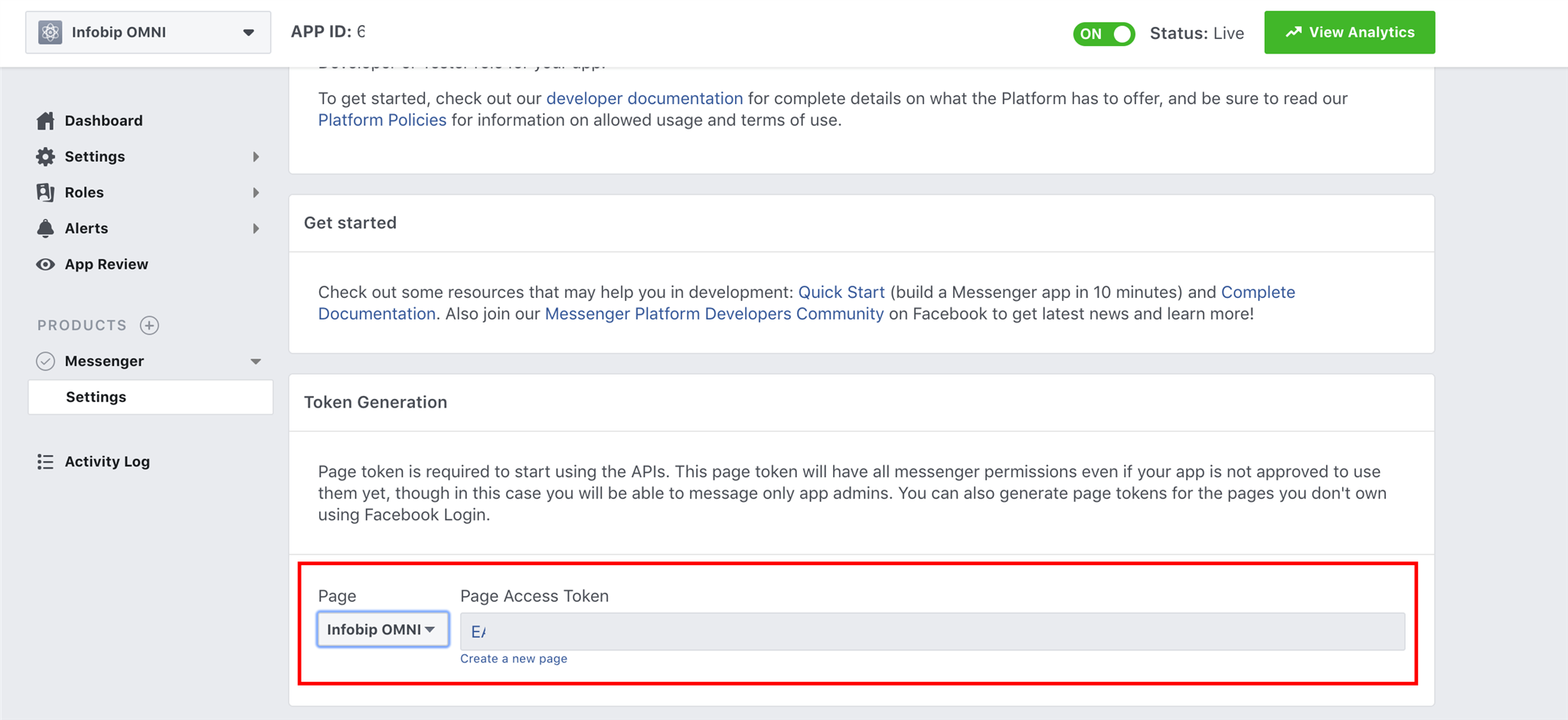 3. In the Token Generation section select your page and a new Page Access Token will be generated.
