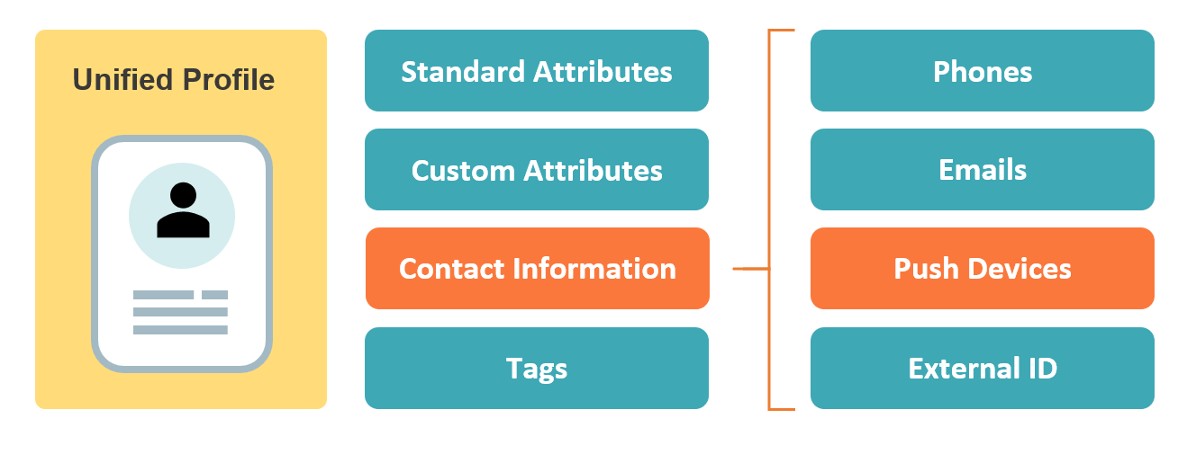 Each person can have Phone numbers, Emails or External ID. These fields are unique identifiers of a person on Infobip platform and provide a capability to personalize any push device registration with a person profile. The platform provides data grouping functions based on these parameters. For example, if two devices will try to save the same Phone number, then both of them will be collected under a single person. Phone number, Email and External ID are also widely used when targeting users with messages across different channels via Infobip platform.