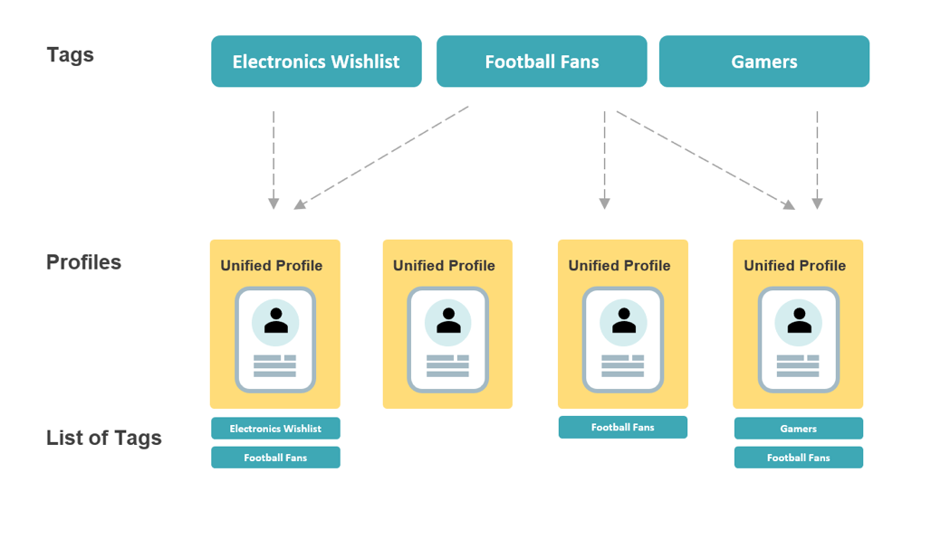 A tag becomes handy when you want to group all persons according to a specific interest or attribute (i.e., you want to tag all persons with the label "Electronics Wishlist" who added items from the electronics category to their wishlist to send them a campaign with special electronics offers later).