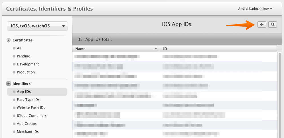 You will see a list of your App IDs. Select the + button to register a new App Id.