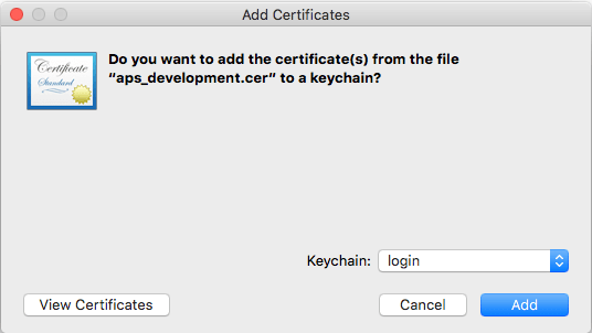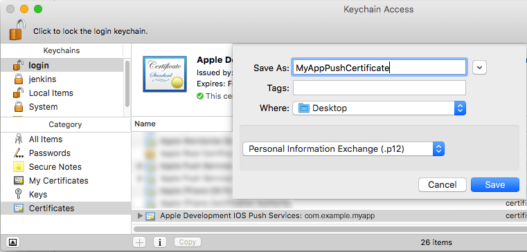 Open the Keychain Access utility, and locate the certificate you just added under “My Certificates”. It should be called “Apple Development Push Services: “ if it is a development certificate, or “Apple Push Services: “ if it is a production certificate.