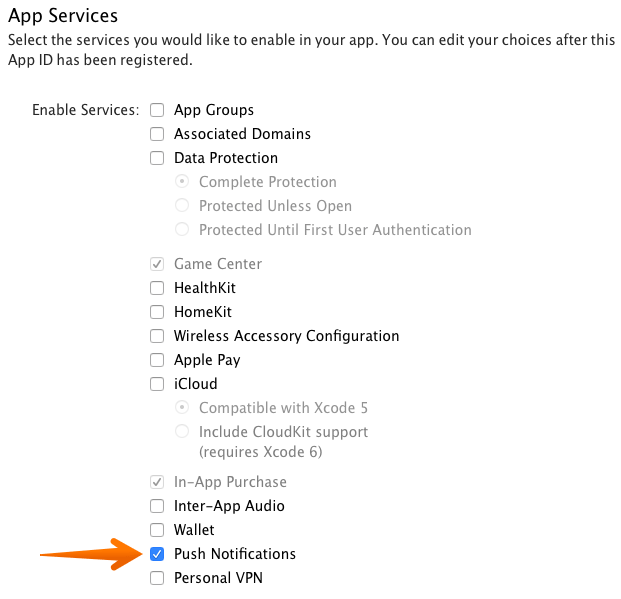 Now that you’ve created a new App ID (or chosen an existing Explicit App ID), it’s time to configure the App ID for Push Notifications.