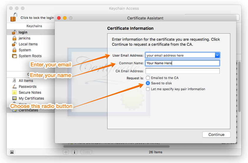 - Follow the instructions in the next screen to create a Certificate Signing Request (CSR) using the Keychain Access utility on your Mac. This will be used to authenticate the creation of the SSL certificate.