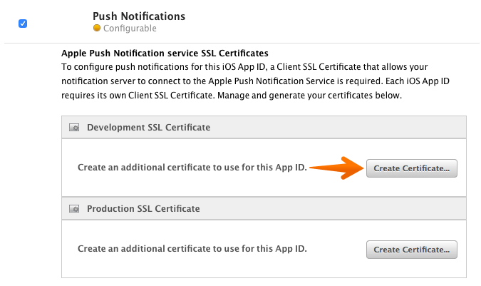 - Scroll down to the Push Notifications section. Here you will be able to create both a Development SSL Certificate, as well as a Production SSL Certificate. Start by selecting