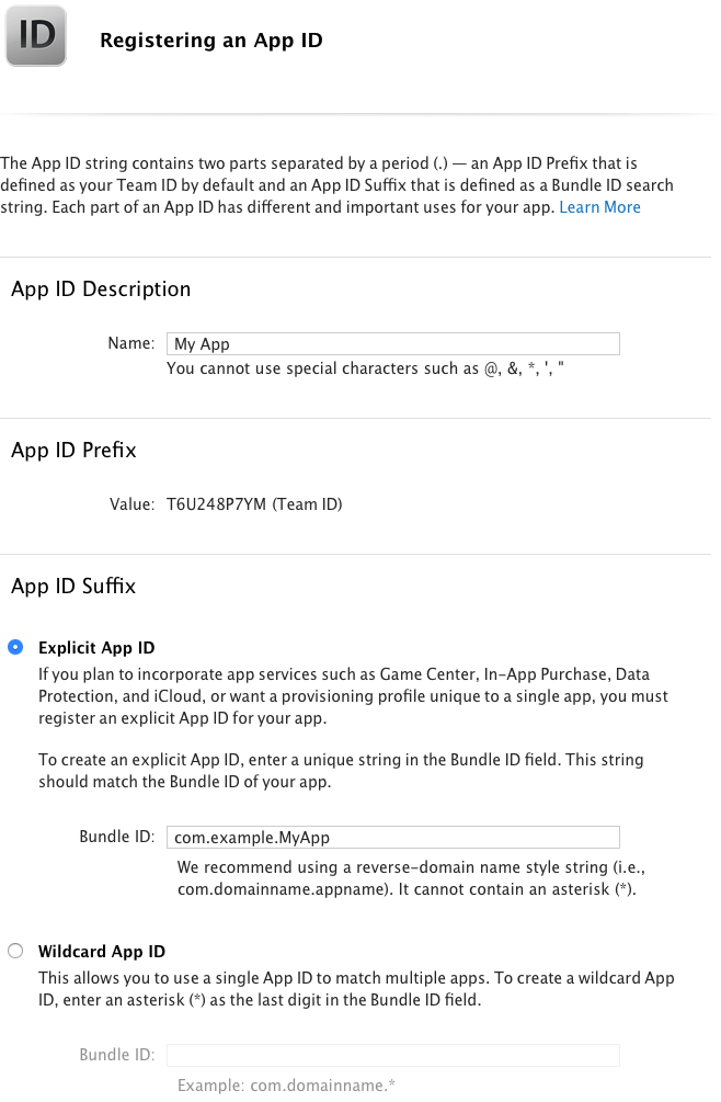 Can I use my existing App ID? If you have already configured an App ID for your app, double check that it was set up as an Explicit App ID. Wildcard App IDs cannot support push notifications and they are easy to identify: the last character in the bundle identifier is an asterisk (*). Wildcard App IDs cannot be converted to Explicit App IDs, but setting up a new App ID for your app is quite straightforward.