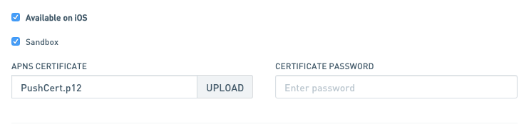 To enable push notifications for iOS just mark the checkbox Available on iOS and insert the certificate you issued during the configuration described in the APNS Certificate Setup Guide.