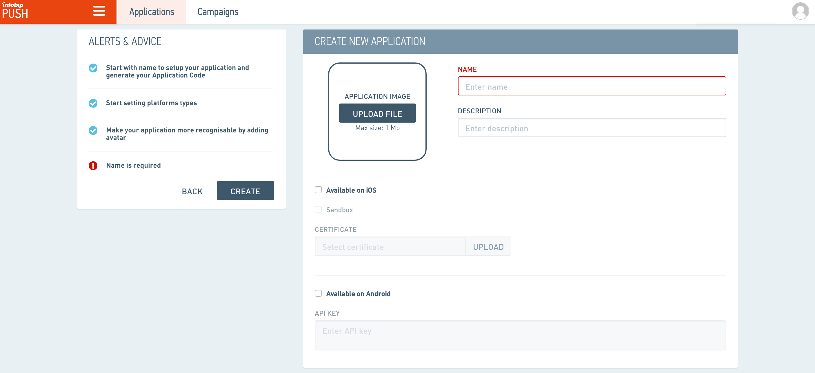 To create your Push application log into the Customer Portal and go to the Create New Application page.