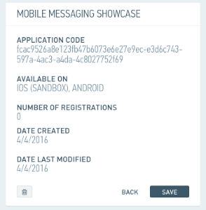 APPLICATION CODE- Application identifier which links your mobile application to the application profile created in Infobip Platform.AVAILABLE ON- Enabled platforms.NUMBER OF REGISTRATIONS- Number of active users in your application from both iOS and Android platforms registered for the Application.DATE CREATED- timestamp for when application was created.DATA LAST MODIFIED- timestamp of the last modifications in the application configuration.