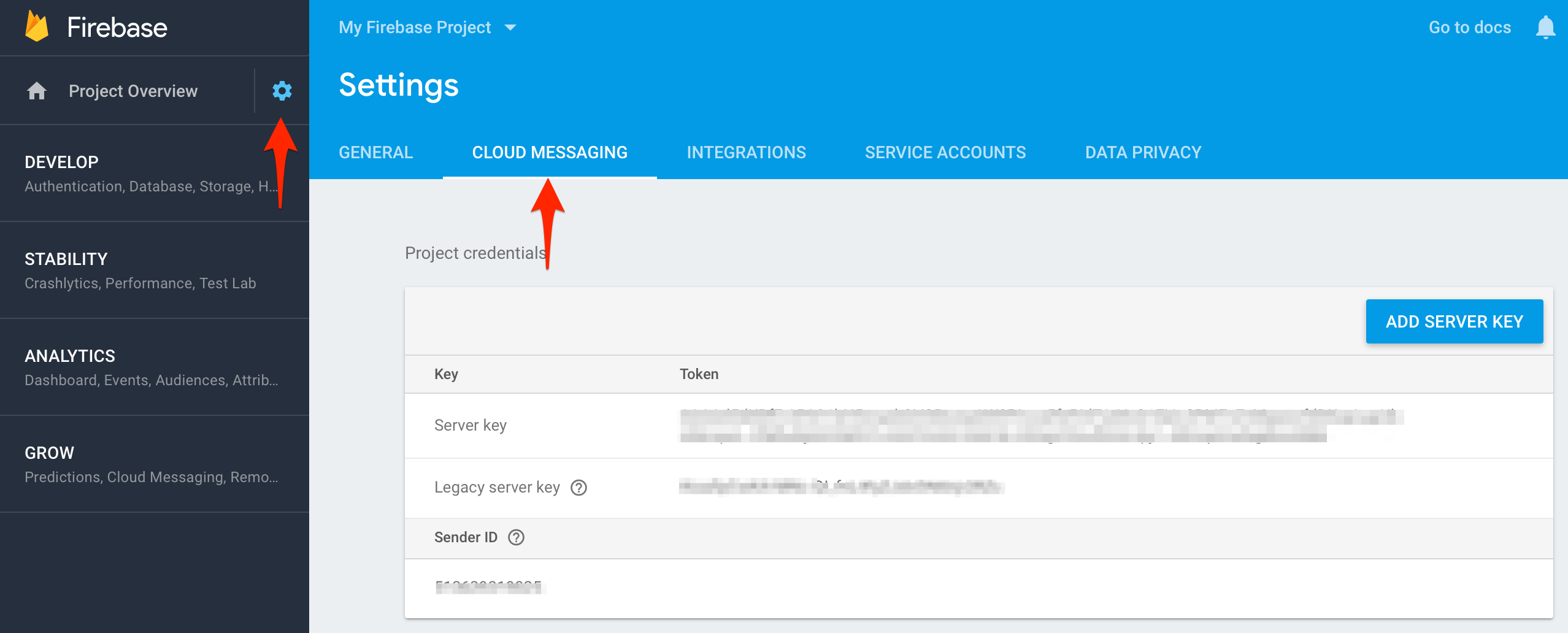 Next, you need to go to the Cloud Messaging settings of your Firebase project and find Server API key and Sender ID.