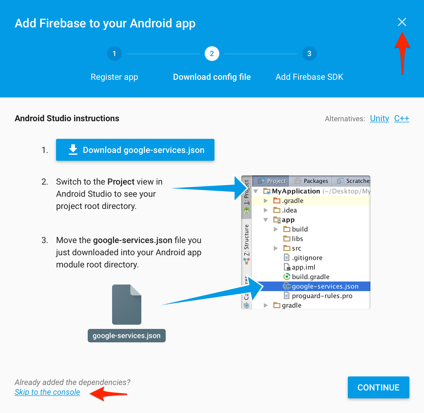 Now your Android app is added to Firebase Console, you can skip the next screen.